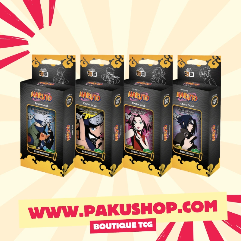 Team Sets Naruto Mythos TCG : voici les coffrets collector incontournables dédiés aux quatre membres iconiques de l’Équipe 7 : Naruto Uzumaki, Sasuke Uchiha, Sakura Haruno et Kakashi Hatake. Disponibles en 2ème Édition et entièrement en langue française, ces Team Sets Naruto Mythos TCG s’inscrivent dans le premier chapitre Konoha Shidō et représentent une entrée idéale dans l’univers de ce jeu de cartes à collectionner pour tout fan de la licence Naruto. Que vous soyez joueur compétitif, collectionneur passionné ou fan de longue date de l’anime, les Team Sets Naruto Mythos TCG 2ème Édition sont des produits pensés pour vous.